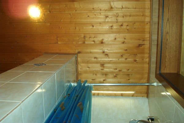 Die Leiste dann mit Heißkleber in die Nut der Holzdecke kleben, so das sie etwas schräg an die Duschwand strahlt und somit das Licht durch die hellen Fliesen besser verteilt.